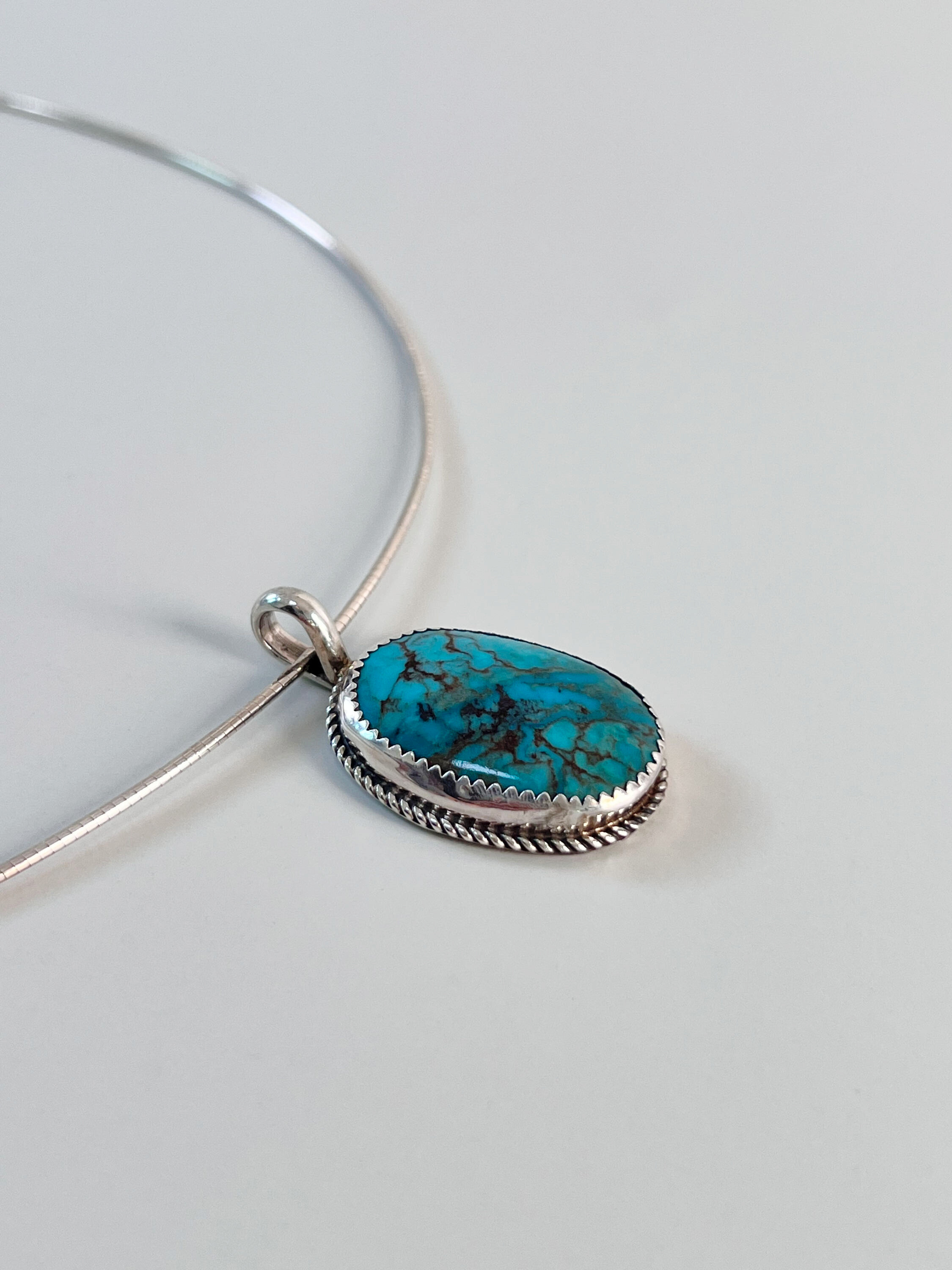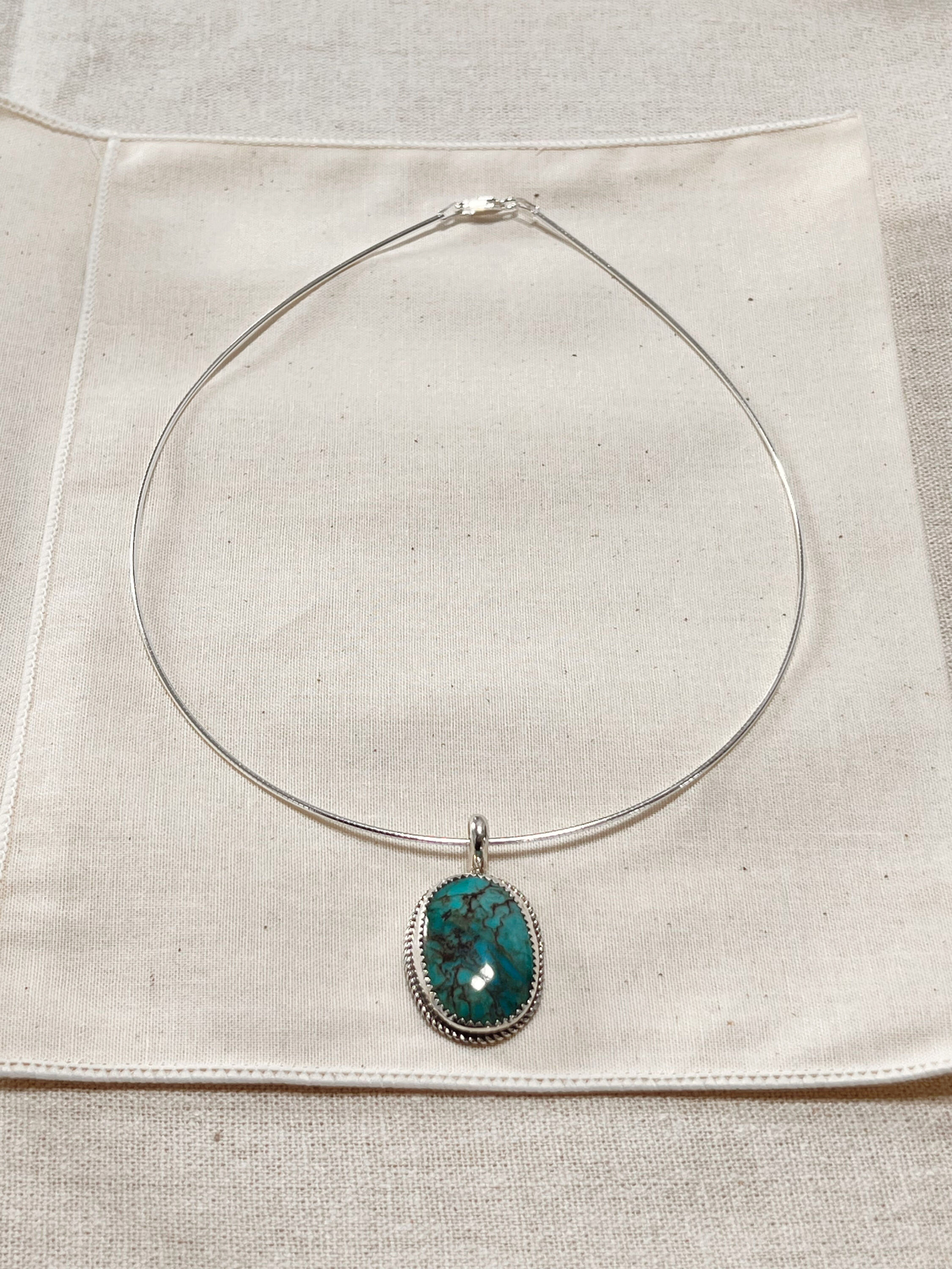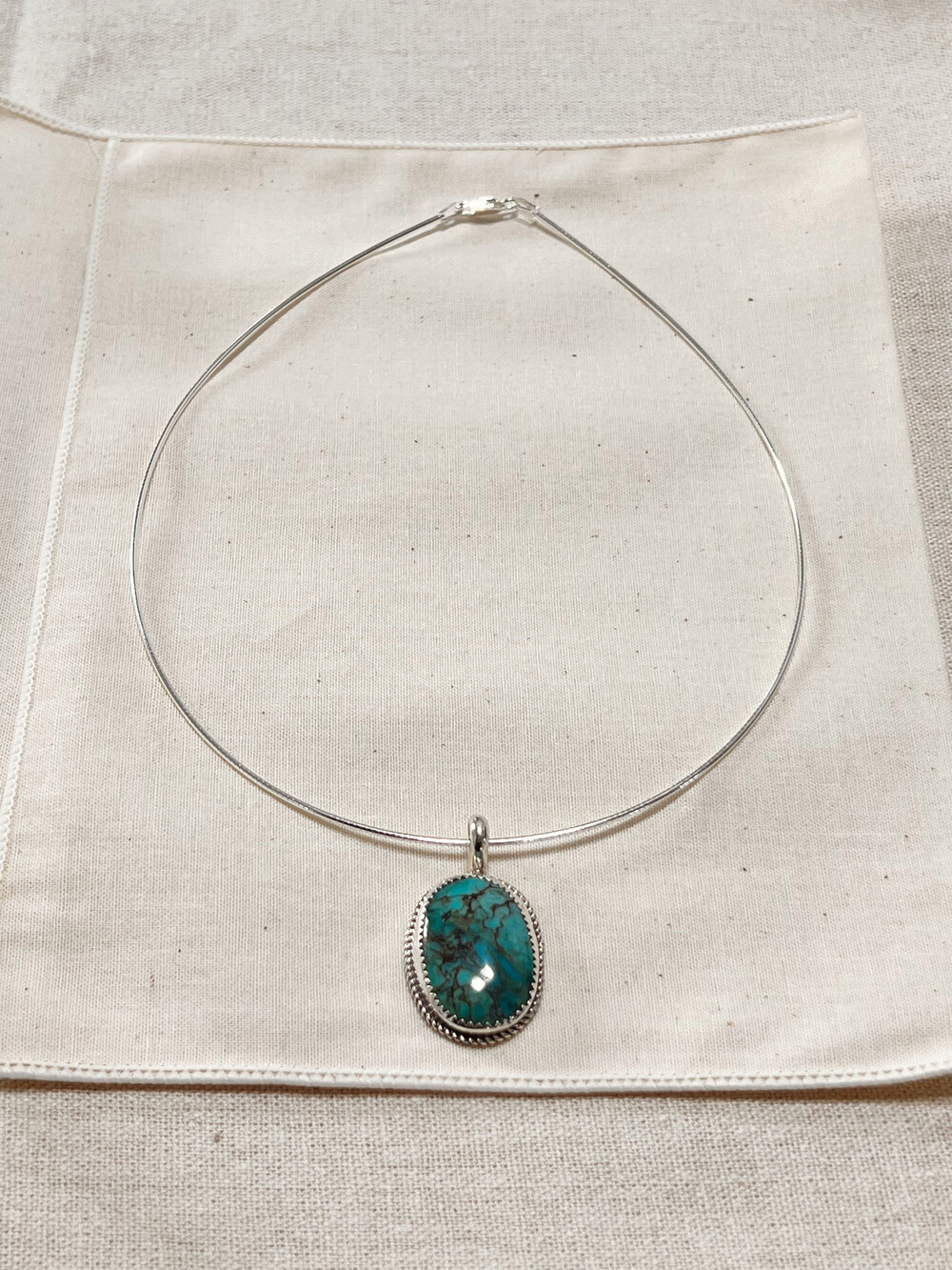 한폭의 수채화가 담긴 듯한 푸른 물빛의 천연 터콰이즈 펜던트 목걸이입니다. 트위스트 와이어 디테일의 925 스털링 실버 세팅으로 원석을 섬세하게 감싸고 있습니다. 이탈리아에서 제작한 체인은 목선에 가볍고 자연스럽게 안착됩니다. 정제된 아름다움, 착용자에게 자연스럽게 스며드는 것을 고려하여 작업하였습니다.
