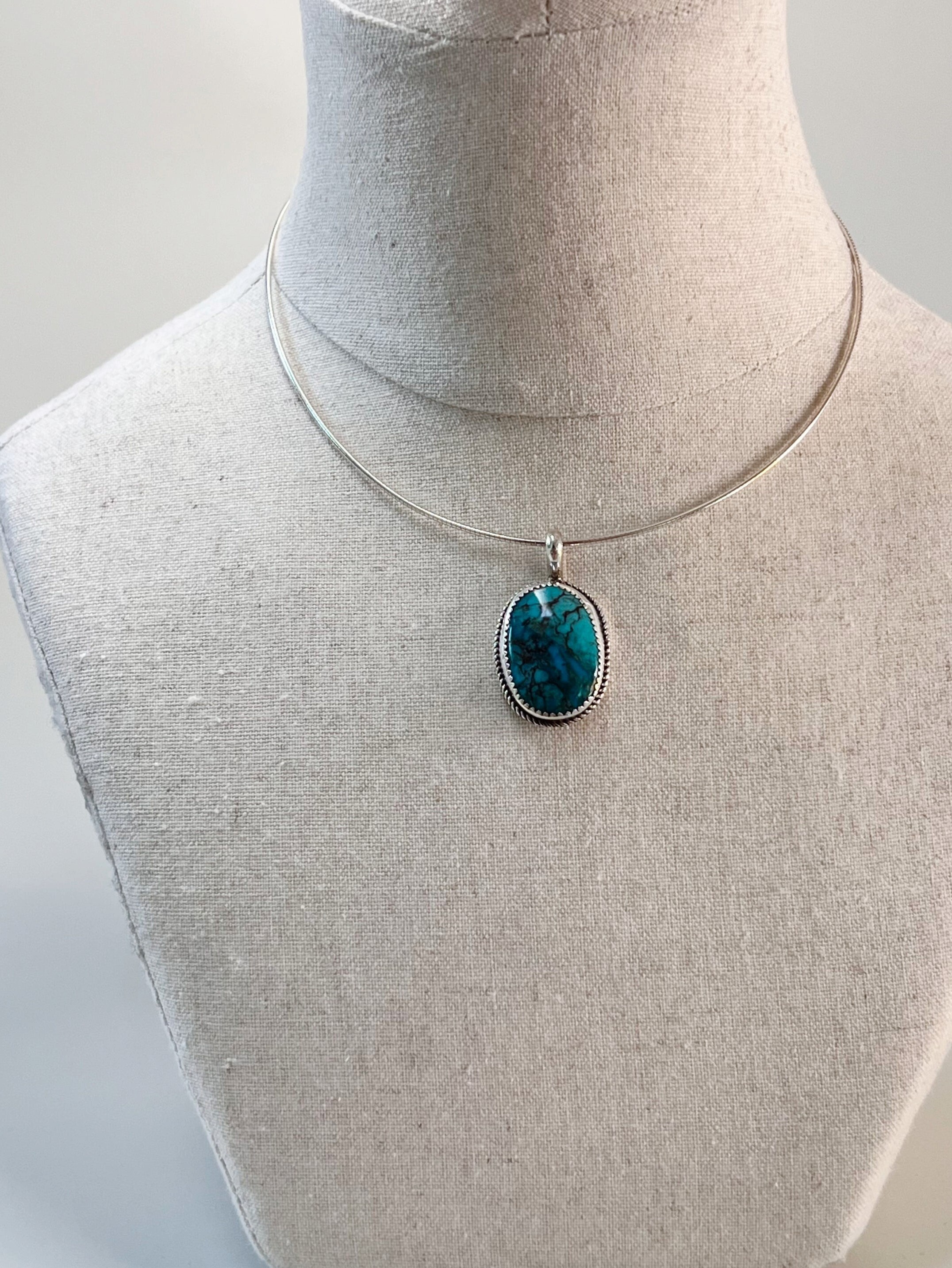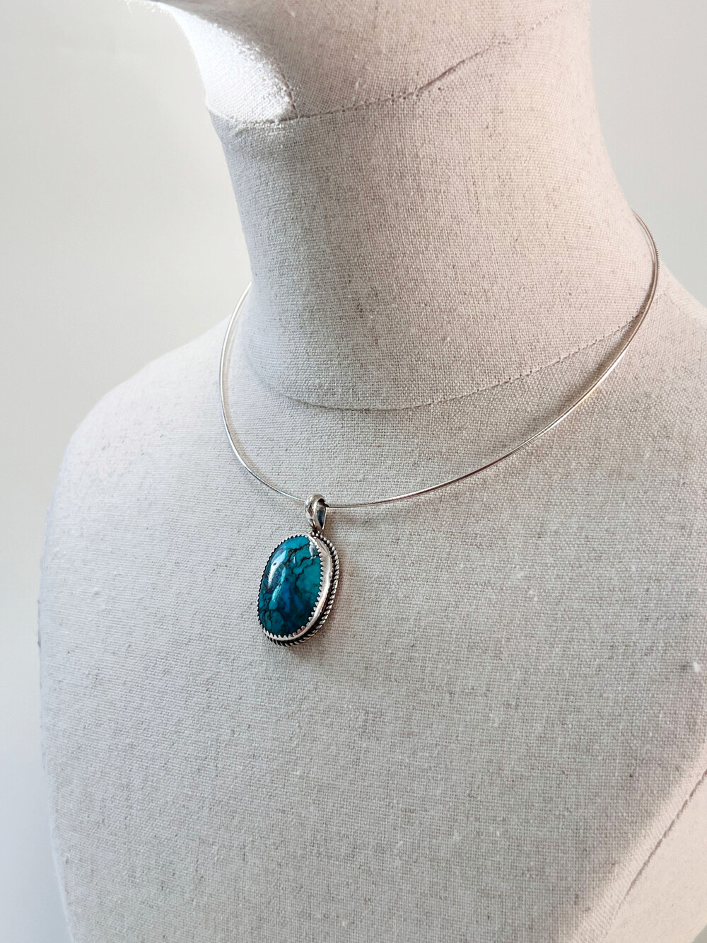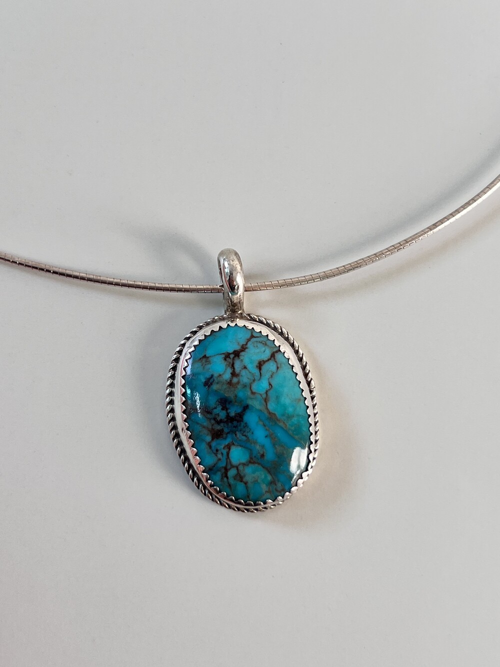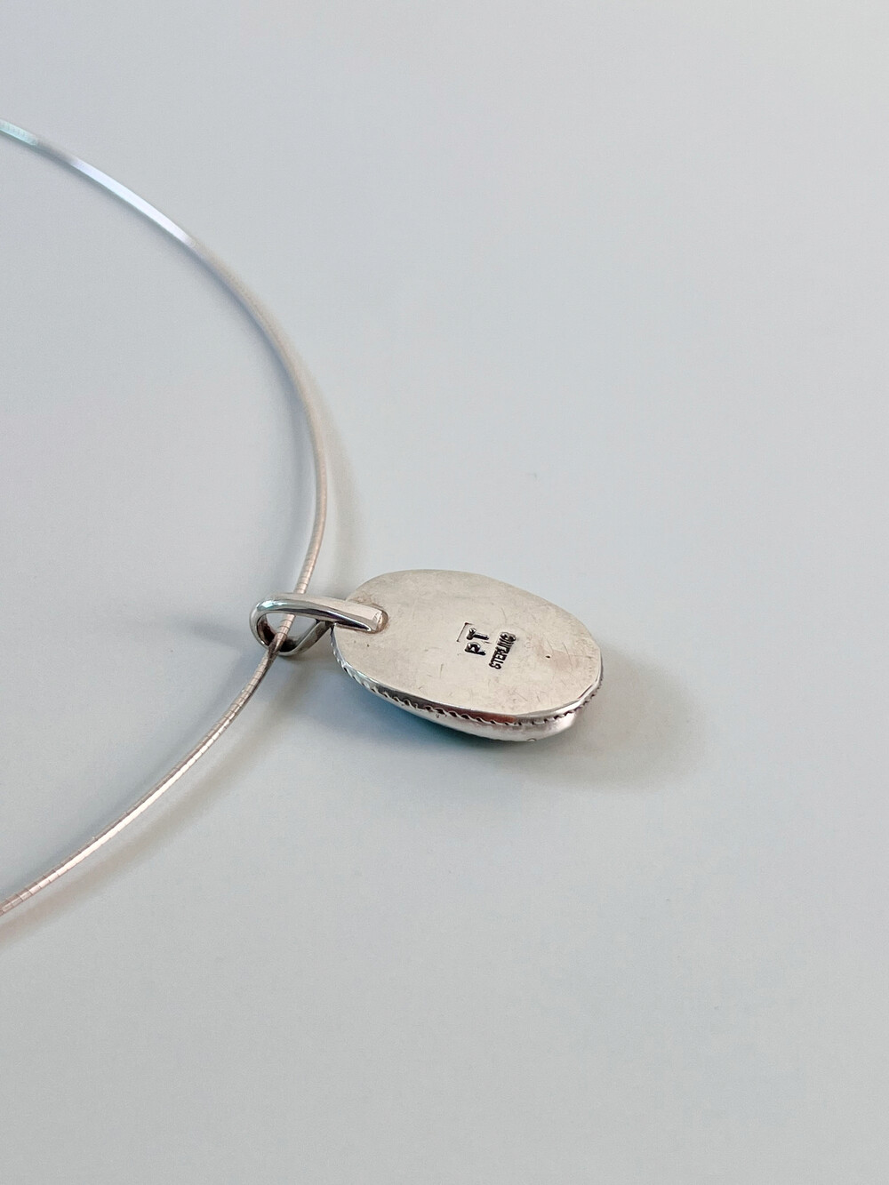 한폭의 수채화가 담긴 듯한 푸른 물빛의 천연 터콰이즈 펜던트 목걸이입니다. 트위스트 와이어 디테일의 925 스털링 실버 세팅으로 원석을 섬세하게 감싸고 있습니다. 이탈리아에서 제작한 체인은 목선에 가볍고 자연스럽게 안착됩니다. 정제된 아름다움, 착용자에게 자연스럽게 스며드는 것을 고려하여 작업하였습니다.