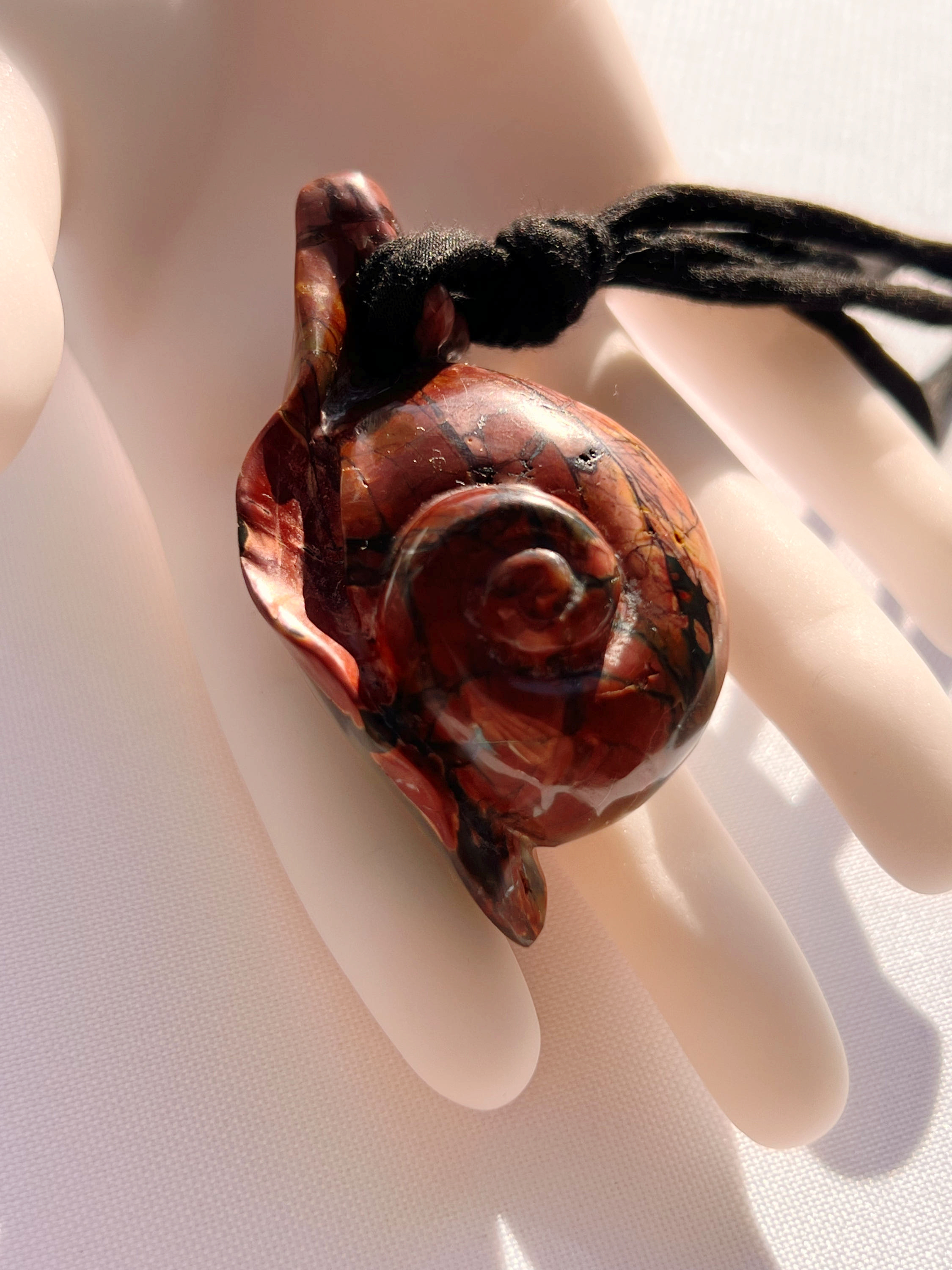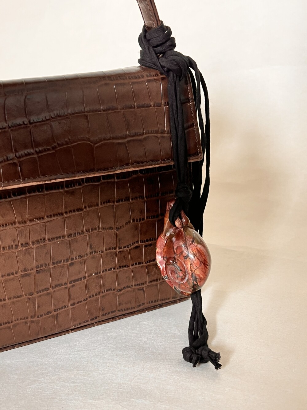 비정형적 패턴의 원석을 섬세한 손 조각으로 세공한 오브제, 직조기를 사용하여 손으로 직조한 후 염색한 부드러운 감촉의 실크 타이로 구성되었습니다. 영감과 손작업을 통하여 하나하나 자세히 들여다보며 만들어진 이 장신구는 착용 방식에 구애받지 않고 끈 길이를 조절하여 착용할 수 있습니다.
