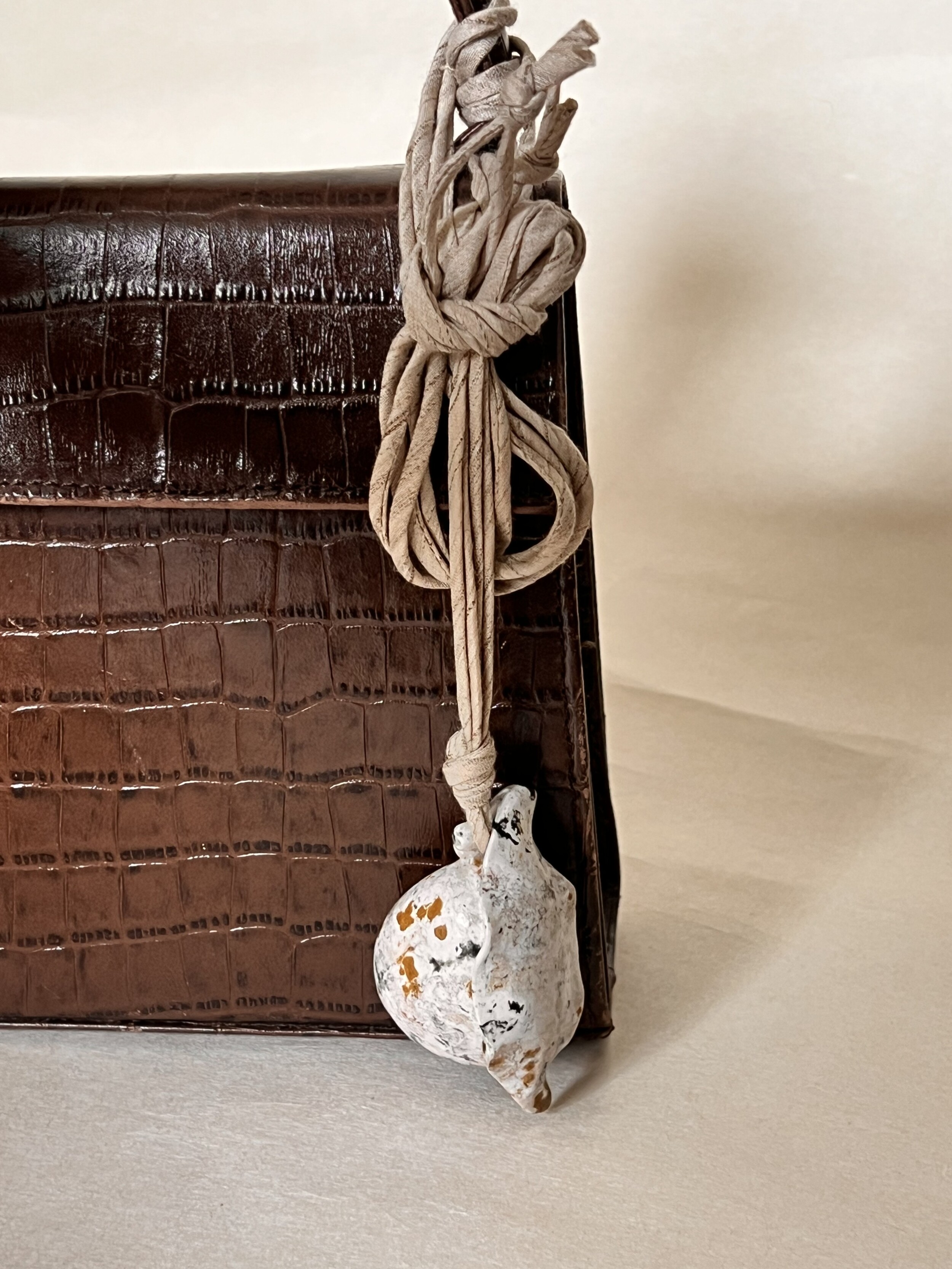 비정형적 패턴의 원석을 섬세한 손 조각으로 세공한 오브제, 직조기를 사용하여 손으로 직조한 후 염색한 부드러운 감촉의 실크 타이로 구성되었습니다. 영감과 손 작업을 통하여 하나하나 자세히 들여다보며 만들어진 이 장신구는 착용 방식에 구애받지 않고 끈 길이를 조절하여 착용할 수 있습니다.